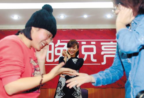 在新片《我愛的是你愛我》中,王珞丹和張涵予一段邊唱著經典老歌《友誼花開萬里香》,邊互相敬禮、扇耳光的劇情,既搞笑又有愛——歌是大叔愛的老歌,但游戲形式卻流露出屬于小妞的活潑。這段戲極受“丹磁”們的喜愛,以90后為主的他們不僅把這首老歌唱得滾瓜爛熟,更把它戲稱為“耳光歌”。昨日本報做客活動的最高潮,就是王珞丹挑選兩對“丹磁”現場表演,而她則在身后唱起這首活潑的“耳光歌”。得知王珞丹親自參與這個環節,現場“丹磁”們卻有些靦腆,王珞丹卻對兩組選手們說:“別羞澀嘛!你們靠我近一點!”貼心的王珞丹還特意講了一遍規則:“石頭剪子布,出一樣的敬禮,贏了的打輸了的——只能打手捂的那面,別太用力哦!”